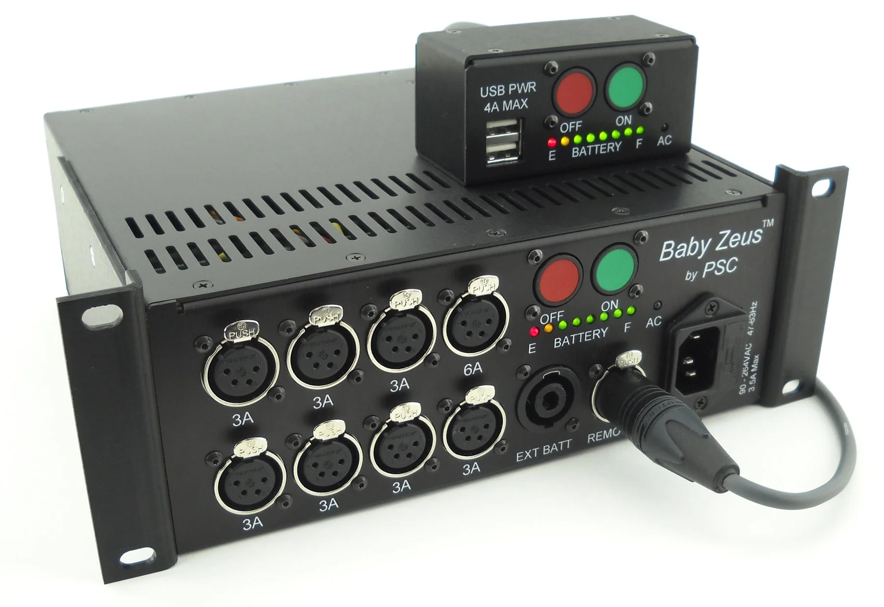 The PSC baby Zeus is our new, compact power distribution product. Engineered using our 35 years of power supply experience, this new single rack space rechargeable power supply will provide you with the ultimate power solution for your small sound cart or remote stage box.