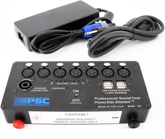 Professional Sound Corporation is pleased to announce our new product the “PSC PowerStar Element” This new product is primarily designed for ease of use when traveling out of the country. Because the battery is separate from this device, you can fly to an overseas job, buy a battery when you arrive there and simply mount the PSC PowerStar Element directly to the battery. No more worries about traveling with or shipping Lithium batteries. This product can also be used as a simple solution for powering small sound carts while in the country. It works well with almost all 12 volt, 35 amp hour SLA (Sealed Lead Acid) and some LiFEPO4 batteries. 12V, 35 amp hour SLA batteries are found world-wide as these are used in personal mobility devices (electric wheel chairs, “rascals” etc. Also included is a set of battery post adapters for use with post less batteries found in many parts of the world (batteries that have 6mm threaded connections). The housing of this new product is CNC machined form a solid block of Delrin. Battery attachment is with simple “Thumb Screws” that require no tools. Each unit comes with a 10 Amp hour universal input battery charger and power cable. The unit is also equipped with 4x USB power output jack offering up to 4 amps of current. A convenient multi-colored LED battery meter is included.
