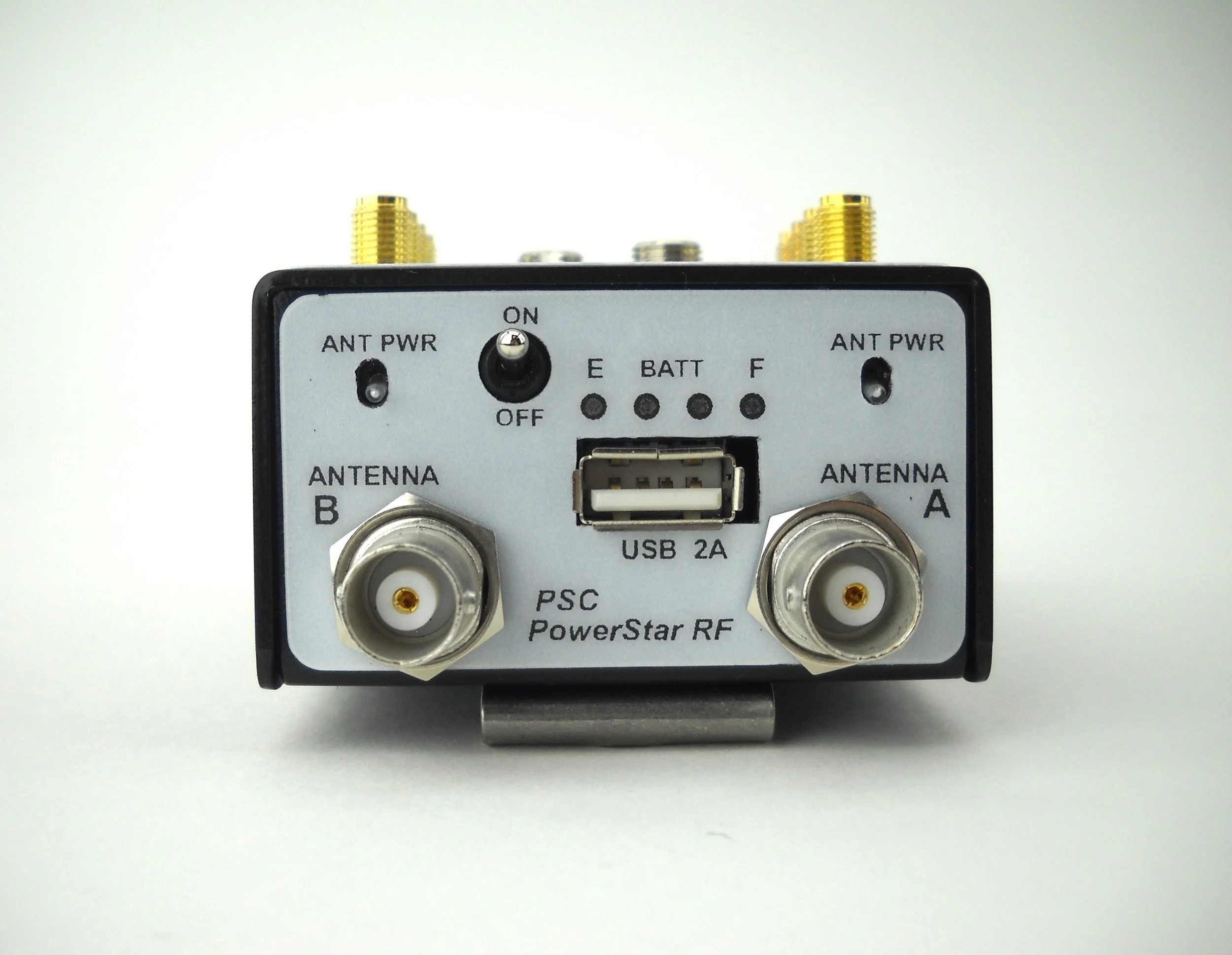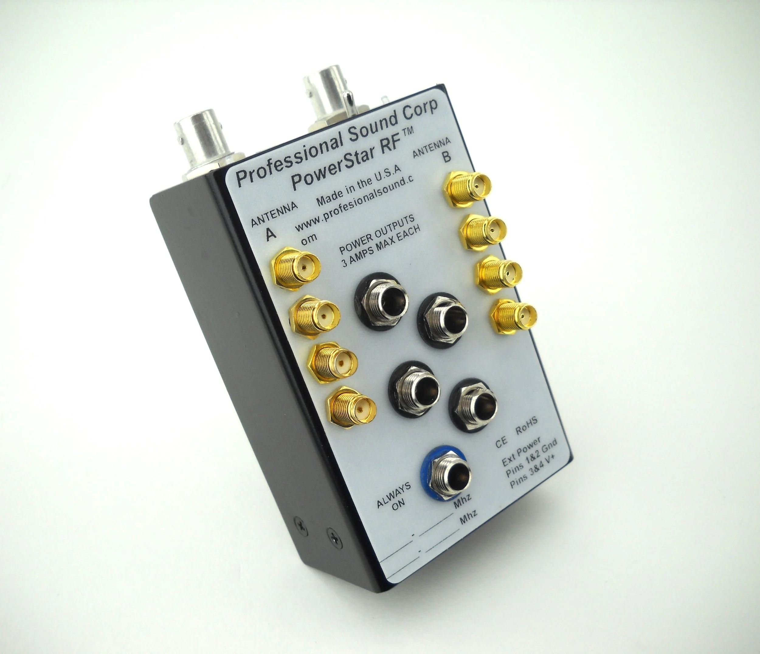 The PSC PowerStar RF combines two of our most popular products. It has a built in Power Distribution system with dual external DC inputs allowing the use of two batteries or a battery and an AC power supply. It also has a built in Diversity RF antenna distribution system. Each half of the RF distribution system offers an active 1x4 RF splitter. You can use this system to feed up to four (4) diversity receivers from one diversity set of receive antennas. This compact, rugged device was developed using the latest super low noise, high current RF amplifiers and will operate over various frequency ranges based on which bandpass filter the unit is built with. Its two inputs are traditional BNC connectors for ease of use in interfacing with your external antennas. It will also provide individually switched DC power to supply remote powered antennas and remote RF amplifiers.