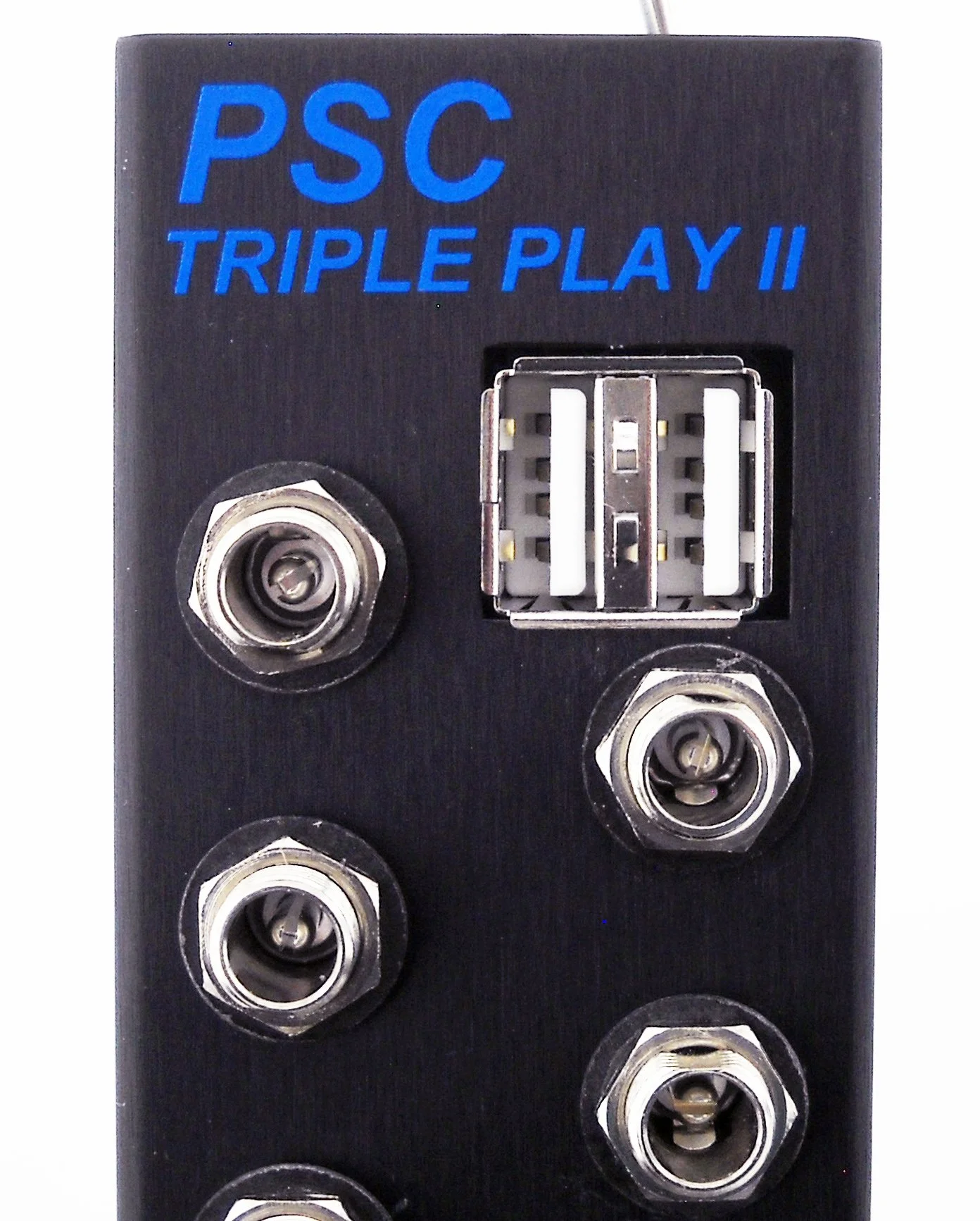 The new PSC PowerStar Mini Triple Play II power distribution system provides a convenient way of distributing clean, quiet, reliable 12Vdc power to all of your ENG Bag and Small Cart based audio equipment from one or more rechargeable batteries. The PSC PowerStar Mini Triple Play II features nine main outputs. Each of these outputs is designed to deliver up to 2 amps of continuous current. The PowerStar Mini Triple Play II has a global (total) current limit of 10 amps. A top panel mounted power switch controls the entire operation. This power switch is a threeway design. When switched to the left, only the USB power outputs connectors will be powered on. This allows continued charging of your USB devices such as an iPhone tm while the rest of your system is powered off. When switched to the center position, everything is turned off including the USB ports. When switched to the right side, everything including the USB connectors is powered on. There is also one connector that is always on and is not controlled by the power switch. This connector is easily identified by the blue ring surrounding the connector.